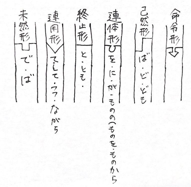 古文における接続とは、語によってどの活用形にくっつくか決まっていることです。